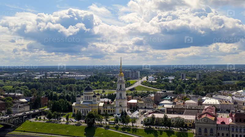Рыбинск, Россия. Рыбинский мост и Спасо-Преображенский собор в Рыбинске, вид с воздуха