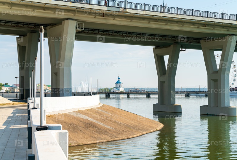 Чебоксары, Россия. Набережная Чебоксарского залива. Московский мост. Церковь Успения Пресвятой Богородицы