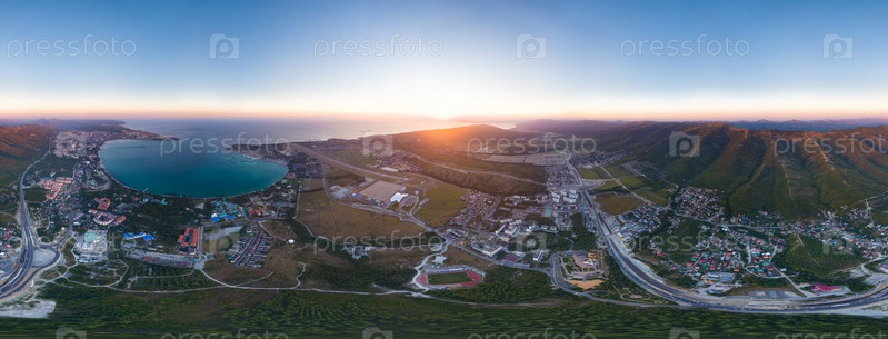 Геленджик, Россия. Панорамный вид на город и залив. Летний закат. Панорама 360. Вид с воздуха