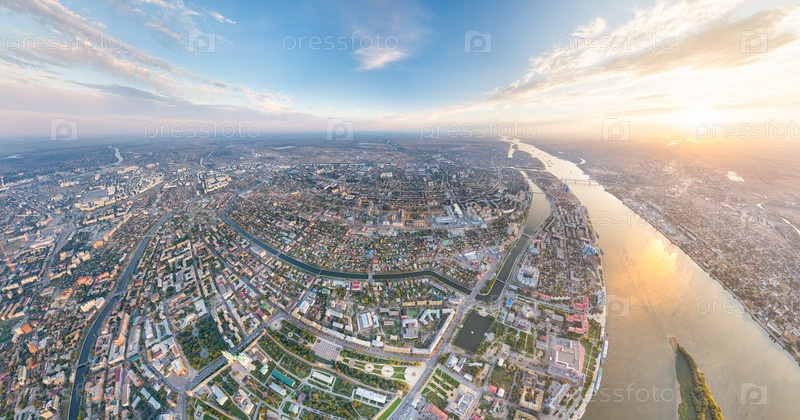 Астрахань, Россия. Астраханский кремль. Панорама города с воздуха летом. река Волга. Время заката. С высоты птичьего полета