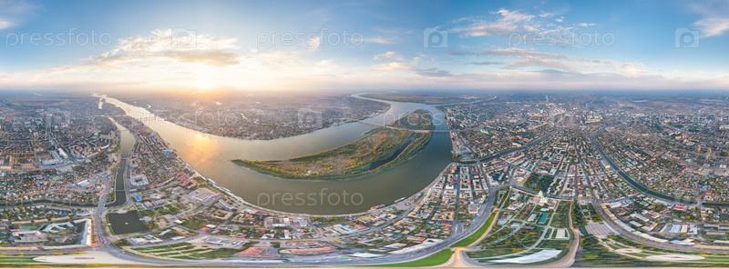 Астрахань, Россия. Панорама города с воздуха летом. Река Волга и остров Городстой. Время заката. Панорама 360. Вид с воздуха