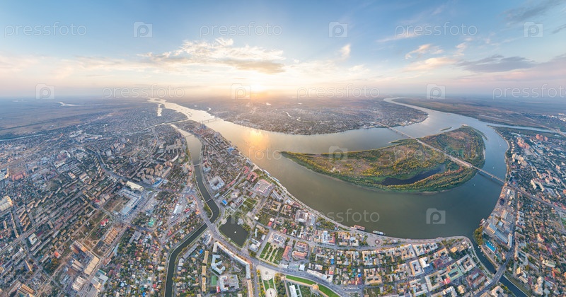 Астрахань, Россия. Панорама города с воздуха летом. Река Волга и остров Городстой. Время заката. С высоты птичьего полета