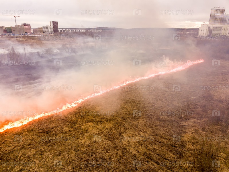 Большой пожар. Горит сухая трава. много дыма. С высоты птичьего полета. Екатеринбург, Россия