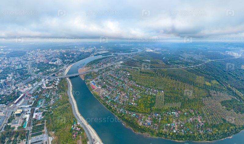 Уфа, Россия. Панорама города с воздуха во время заката. Облачная погода. С высоты птичьего полета