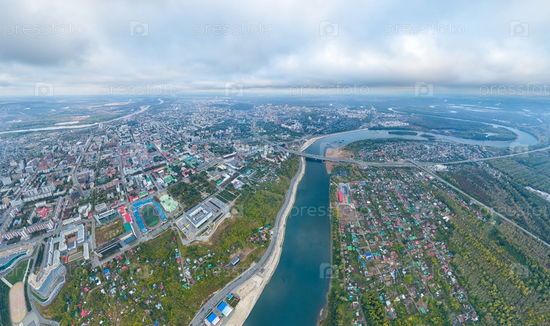 Уфа, Россия. Панорама города с воздуха во время заката. Облачная погода. С высоты птичьего полета