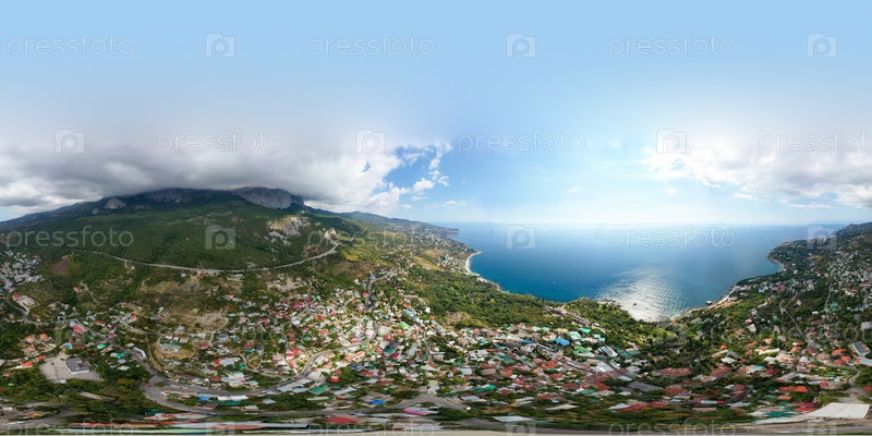 Алупка. Крым. Деревни на берегу Черного моря в свете яркого солнца. Алупка. Панорама 360. Вид с воздуха