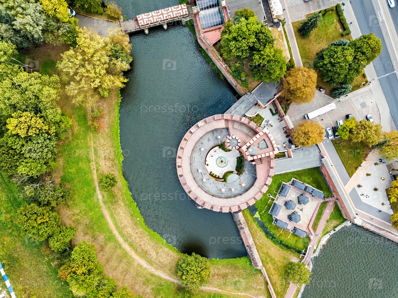 Россия, Калининград. Аэрофотосъемка. Крепостная башня середины девятнадцатого века. Расположен в центре Калининграда на берегу Верхнего озера. ВЫСТРЕЛ В ГОЛОВУ