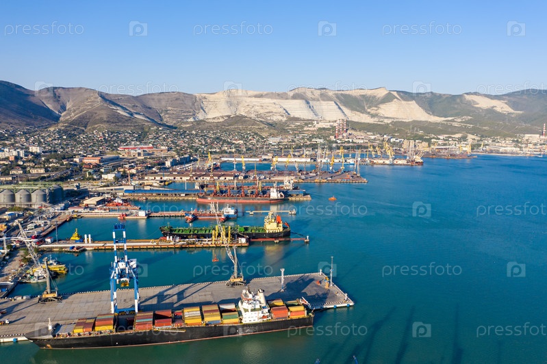 Новороссийск, Россия. Центральная часть города. Порт в Новороссийской бухте. С высоты птичьего полета