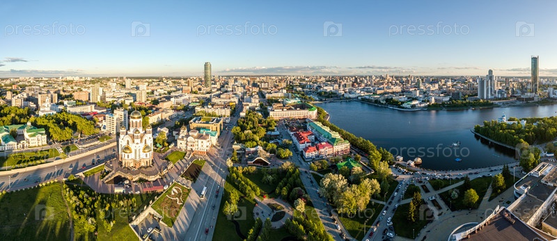 Панорама на закате. Центр города Екатеринбурга. Россия. Аэрофотосъемка