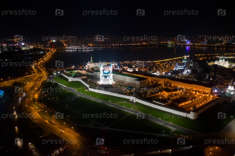 Казань, Россия. Мечеть Кул Шариф. Вид с воздуха на Казанский Кремль. Ночное время