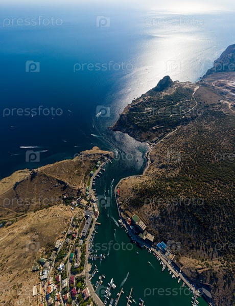 Севастополь, Крым. Балаклавская бухта с яхтами и прогулочными катерами. С высоты птичьего полета