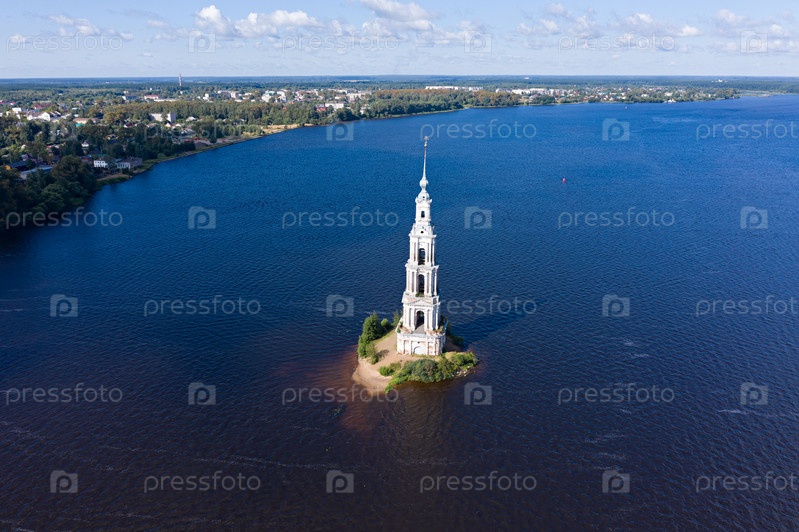 Калязино, Россия. Затопленная Калязинская колокольня. Воды Угличского водохранилища. С высоты птичьего полета