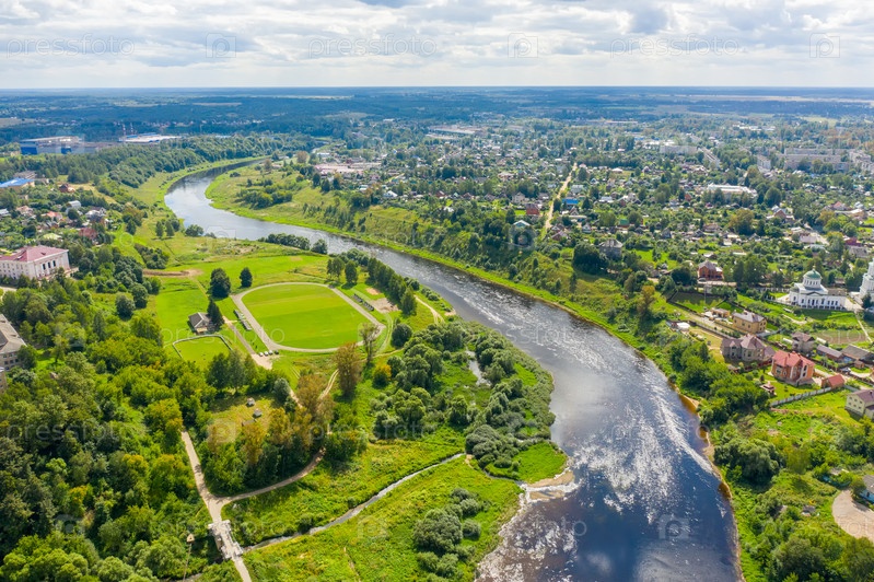 Ржев, Россия. Панорама центра города. Вид с воздуха на Волгу и набережную