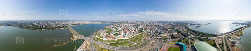 Казань, Россия. С высоты птичьего полета. Круговая панорама Казани с Казанским Кремлем в центре
