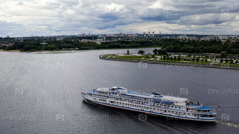 Россия, Ярославль - 14 августа 2020 г.: Круизный лайнер "Павел Божев" проходит по Волге вдоль парка на Стрелке (Стрелке), вид с воздуха
