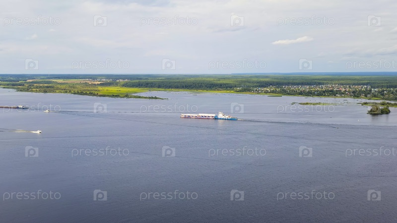 Рыбинск, Россия. Баржа и сухогруз на Рыбинском водохранилище, в районе шлюзов, вид с воздуха