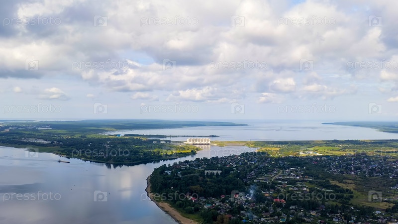 Рыбинск, Россия. Река Волга, Рыбинская ГЭС на горизонте, вид с воздуха