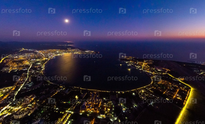 Геленджик, Россия. Вид на ночной город, залив и луну. Лето. С высоты птичьего полета