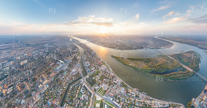 Астрахань, Россия. Панорама города с воздуха летом. Река Волга и остров Городстой. Время заката. С высоты птичьего полета
