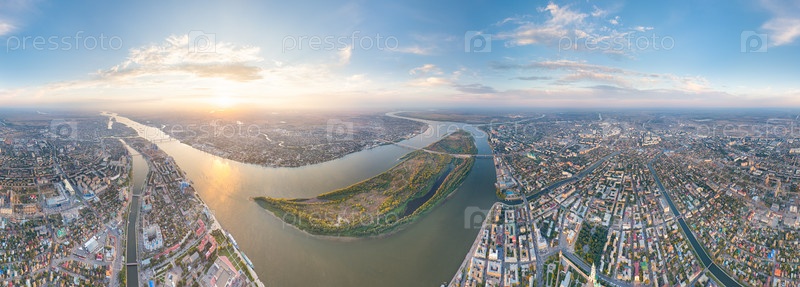 Астрахань, Россия. Панорама города с воздуха летом. Река Волга и остров Городстой. Время заката. Панорама 360. Вид с воздуха
