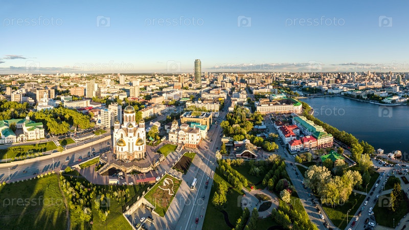 Панорама на закате. Центр города Екатеринбурга. Россия. Аэрофотосъемка