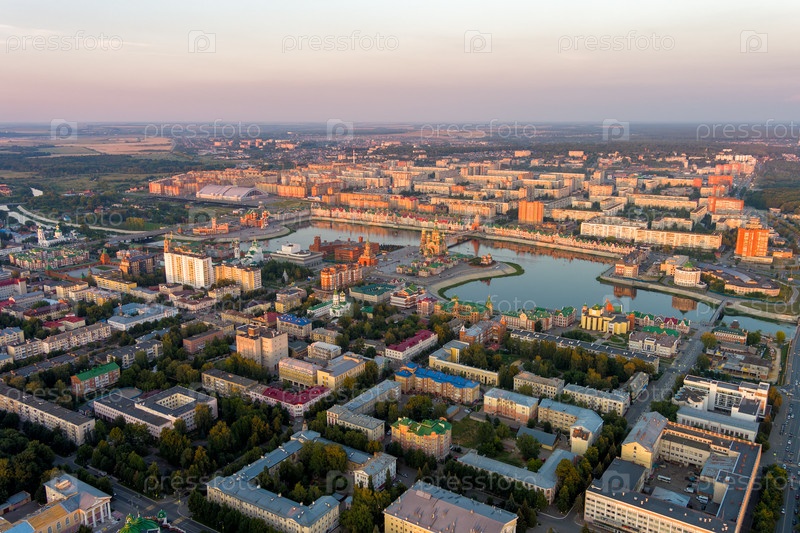 Йошкар-Ола, Россия. Панорама центра города во время заката. С высоты птичьего полета