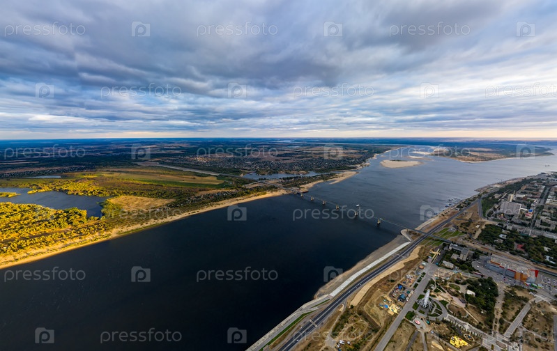Волгоград, Россия. река Волга. Вид с воздуха во время заката. Падать