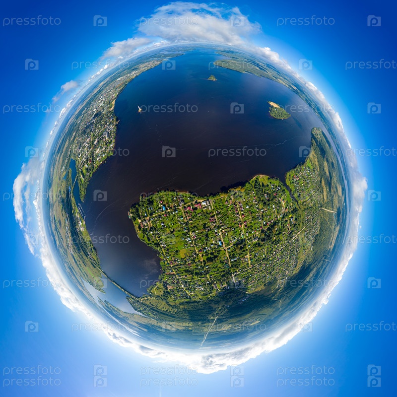 Калязино, Россия. Воды Угличского водохранилища. С высоты птичьего полета. 360-градусный панорамный астероид