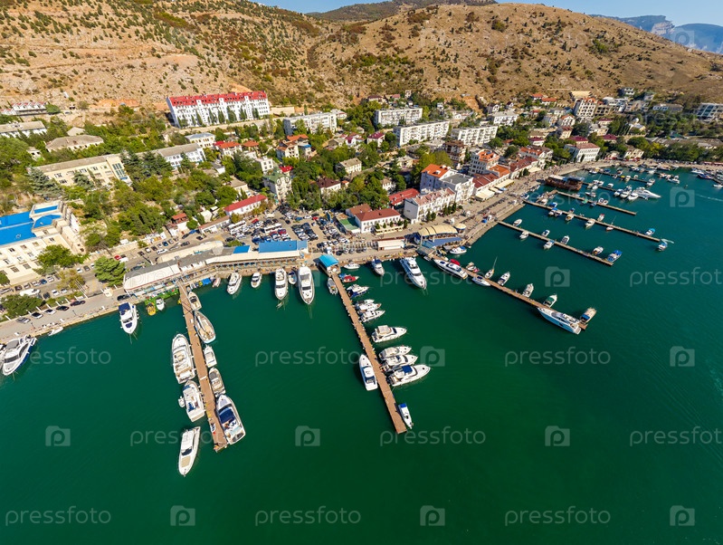 Севастополь, Крым. Балаклавская бухта с яхтами и прогулочными катерами. С высоты птичьего полета