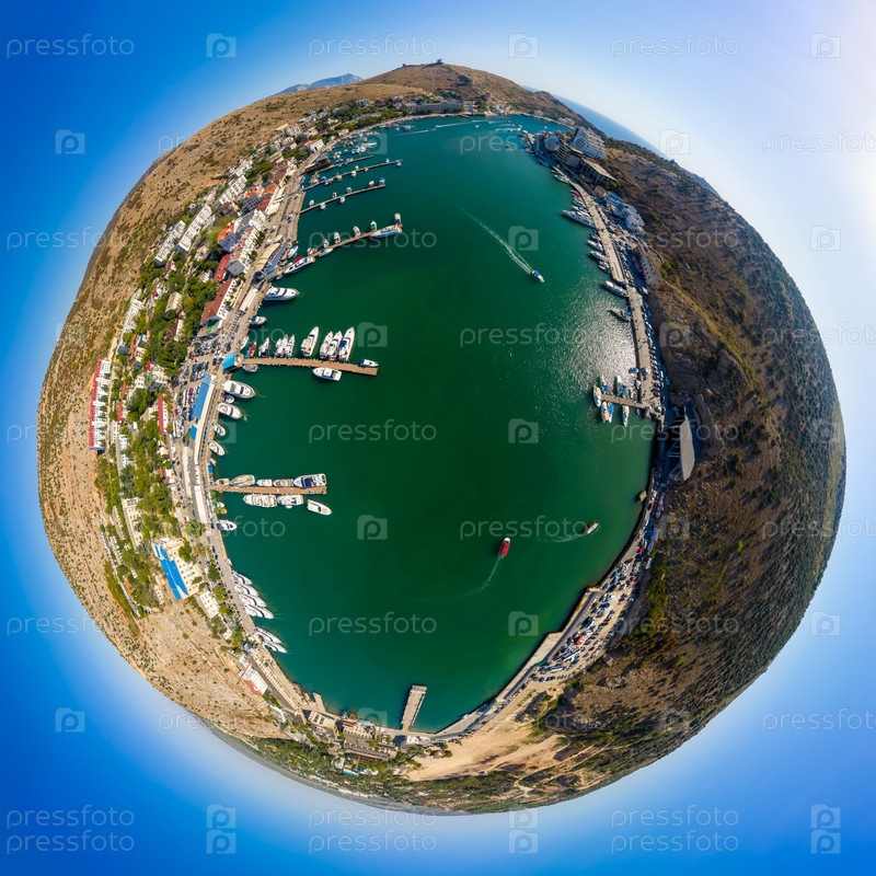Севастополь, Крым. Балаклавская бухта с яхтами и прогулочными катерами. С высоты птичьего полета. 360-градусный панорамный астероид