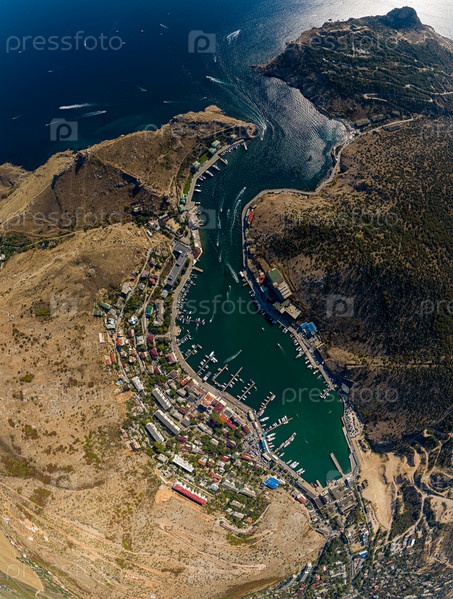 Севастополь, Крым. Балаклавская бухта с яхтами и прогулочными катерами. С высоты птичьего полета