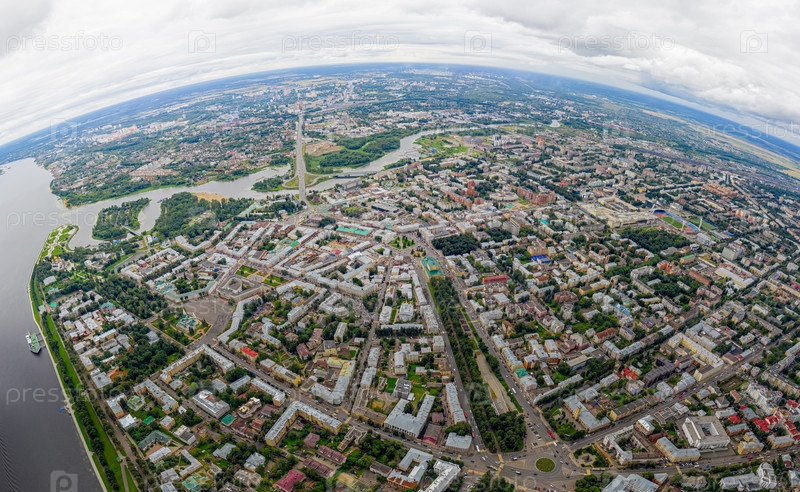 Ярославль, Россия. Волжская набережная. Облачная погода. Панорама с высоты птичьего полета