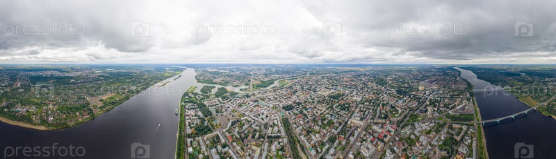 Ярославль, Россия. Волжская набережная. Облачная погода. Панорама с высоты птичьего полета 360