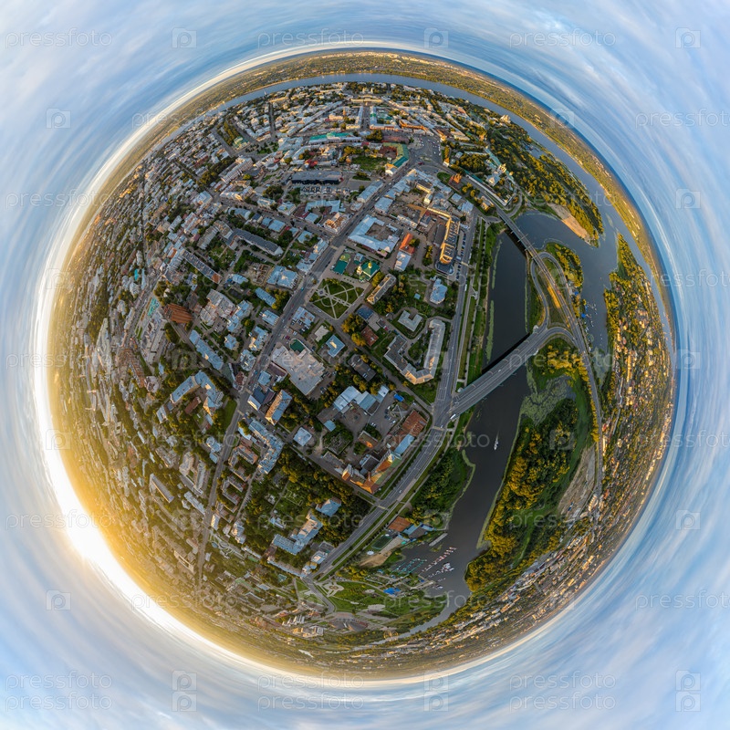 Ярославль, Россия. Исторический центр города Ярославля. Вид с воздуха на закате. 360-градусный панорамный астероид