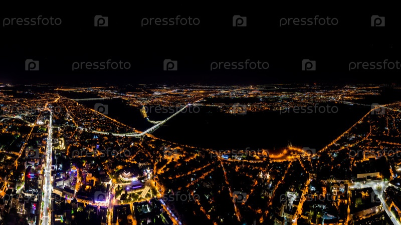 Воронеж, Россия. Ночная панорама города Воронежа с воздуха. Яркие уличные фонари. С высоты птичьего полета