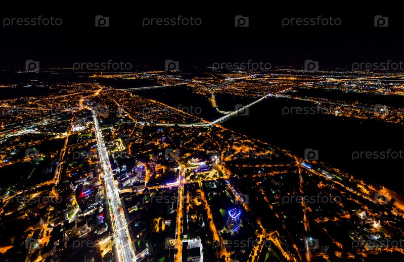 Воронеж, Россия. Ночная панорама города Воронежа с воздуха. Яркие уличные фонари. С высоты птичьего полета