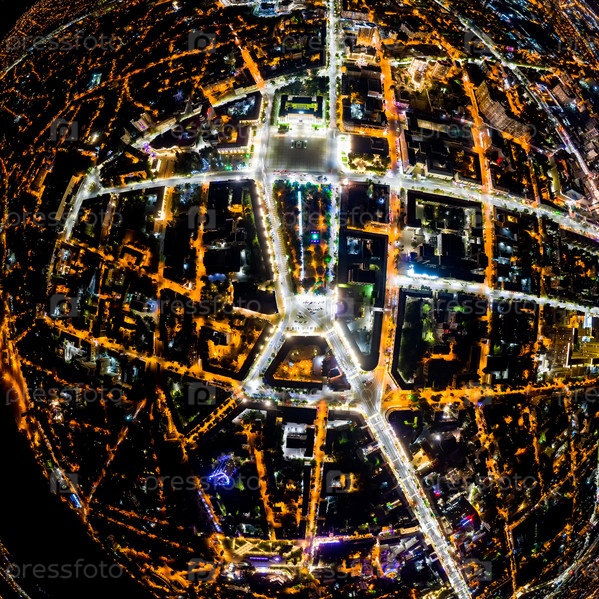 Воронеж, Россия. Площадь Ленина и Кольцовская площадь. Ночная панорама города Воронежа с воздуха. Яркие уличные фонари. С высоты птичьего полета