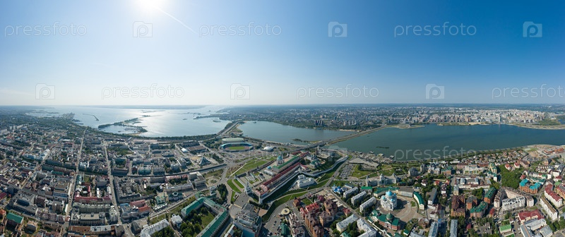Казань, Россия. Панорама центральной части города, вид на слияние рек Волги и Казанки. С высоты птичьего полета