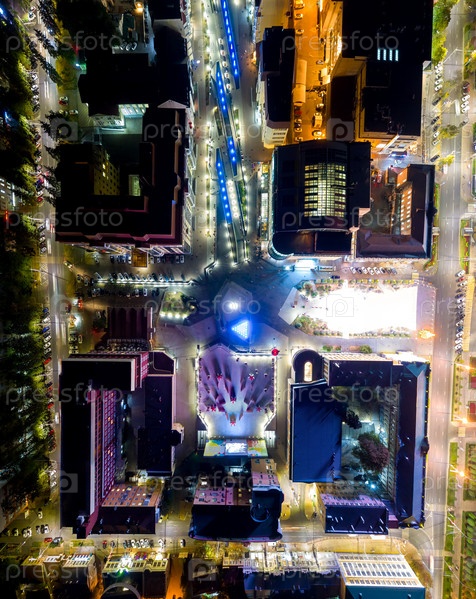 Ставрополь, Россия. Вид с воздуха на центр города ночью. Каскад фонтанов. Огни ночного города