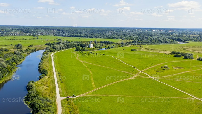Россия, Боголюбово. Вид с воздуха на церковь Покрова на Нерли. Православная церковь и символ средневековой России, вид с воздуха
