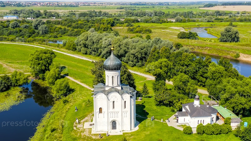 Россия, Боголюбово. Вид с воздуха на церковь Покрова на Нерли. Православная церковь и символ средневековой России, вид с воздуха