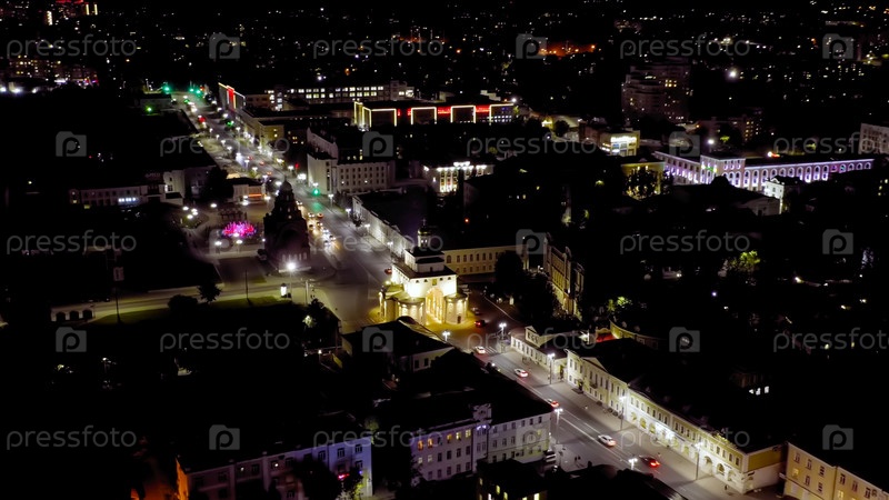 Россия, Владимир. Ночной город с воздуха. Золотые ворота (Владимир), вид с воздуха