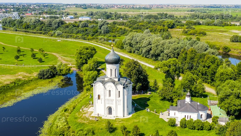 Россия, Боголюбово. Вид с воздуха на церковь Покрова на Нерли. Православная церковь и символ средневековой России, вид с воздуха