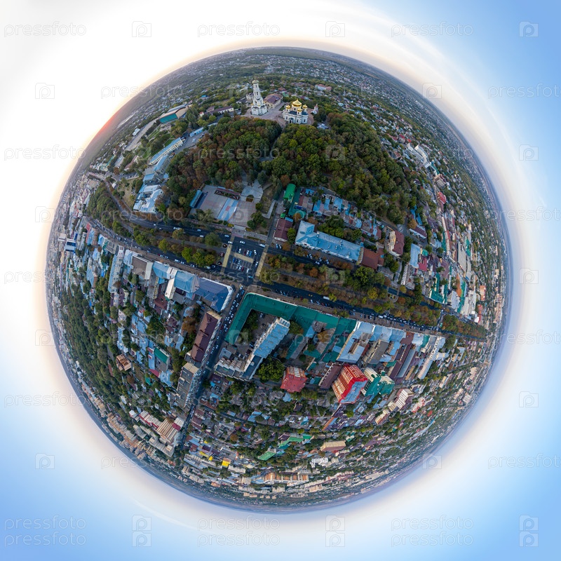 Ставрополь, Россия. Вид с воздуха на центр города во время заката. Падать. 360-градусный панорамный астероид