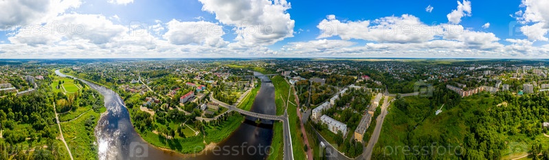 Ржев, Россия. Панорама 360 центра города. Вид с воздуха на Волгу и набережную