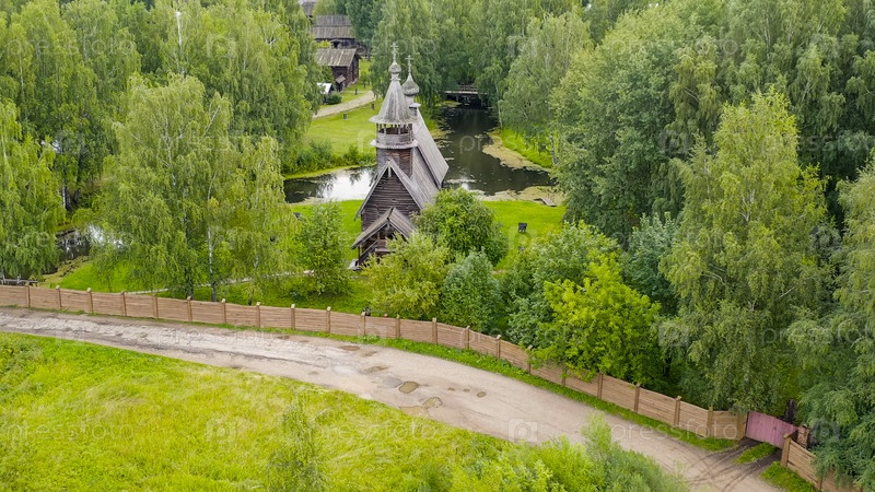 Россия, Кострома. Костромская Слобода. Традиционные русские дома и церкви, вид с воздуха