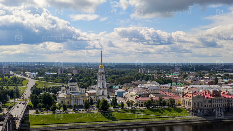 Рыбинск, Россия. Рыбинский мост и Спасо-Преображенский собор в Рыбинске, вид с воздуха