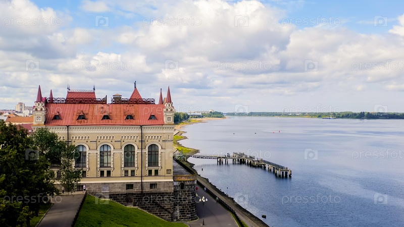 Рыбинск, Россия. Здание бывшей хлебной биржи и набережная реки Волги, вид с воздуха