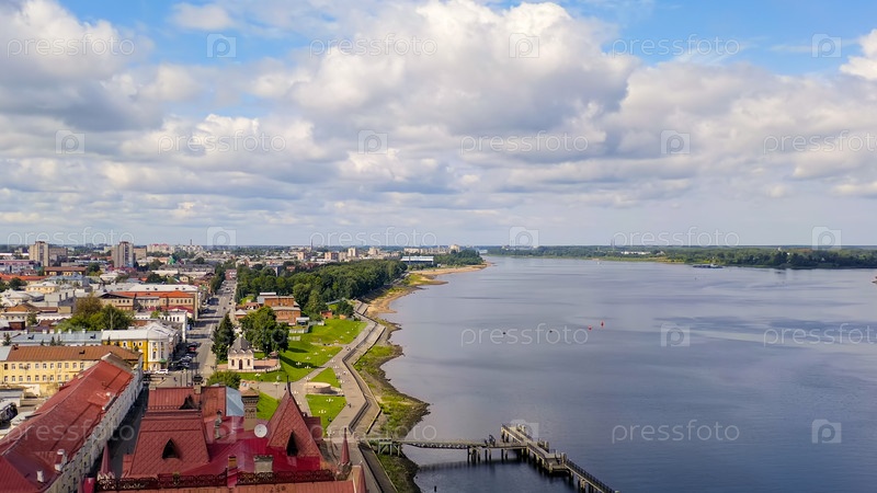 Рыбинск, Россия. Здание бывшей хлебной биржи и набережная реки Волги, вид с воздуха