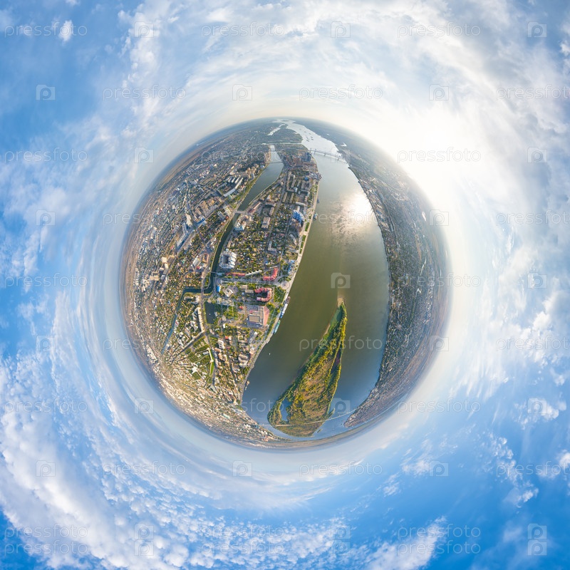 Астрахань, Россия. Панорама города с воздуха летом. Река Волга и остров Городстой. 360-градусный воздушный панорамный астероид